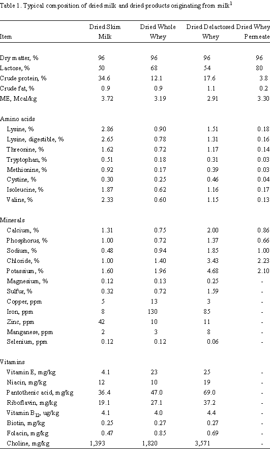 68% lactose and 12% protein (Table 1, NRC, 1998). The